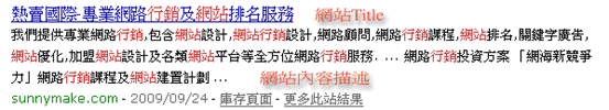 標題與顯示內容是網路關鍵字曝光最重要的兩大門面,必須清楚明白的告知使用者網站的內容及服務內容是否符合使用者的需要,進而點入導進網站內,此部份包含兩部份: